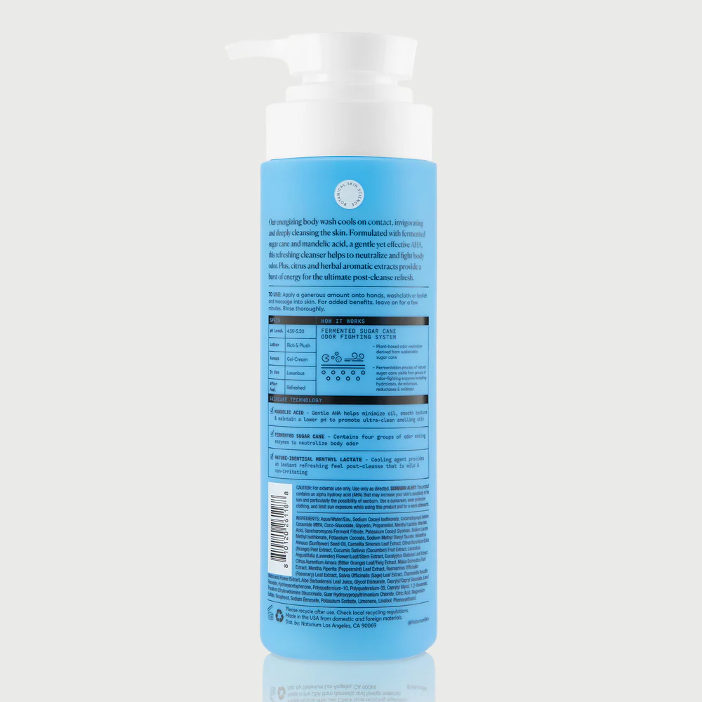Naturium energizing body wash cools on contact, invigorating and deeply cleansing the skin. Formulated with fermented sugar cane and mandelic acid, a gentle yet effective AHA, this refreshing cleanser helps to neutralize and fight body odor. Plus, citrus and herbal aromatic extracts provide a burst of energy for the ultimate post-cleanse refresh.